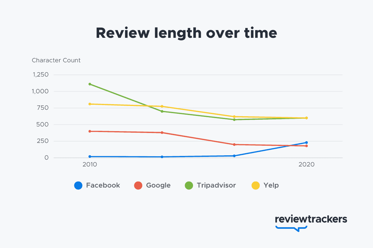 In 2010, the average length of a review was 600 characters. Since then, online reviews statistics show that reviews have gotten 65% shorter, with the average review now coming in at just over 200 characters: about the length of an expanded tweet.