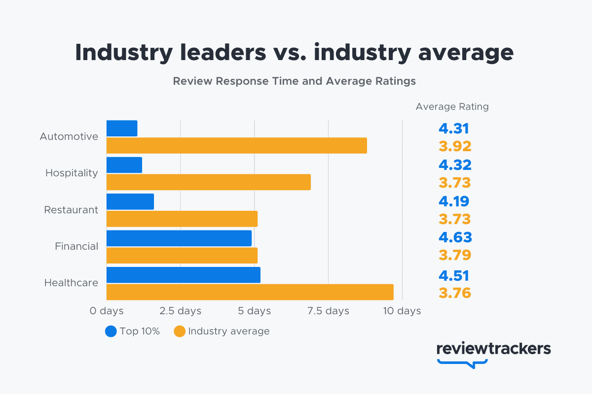 • Responsive industry leaders get higher ratings. Faster review response times are closely linked to having a positive reputation.