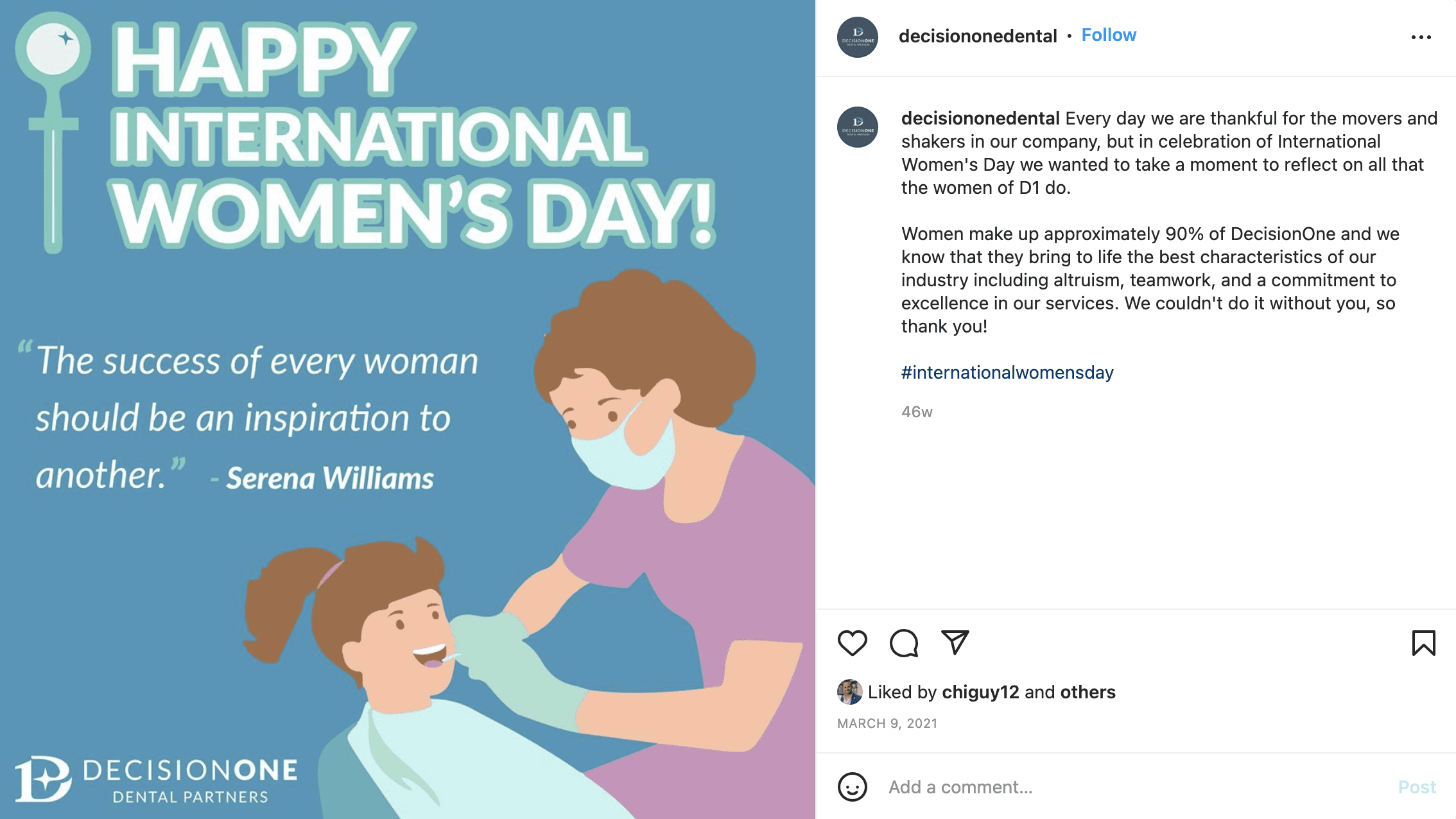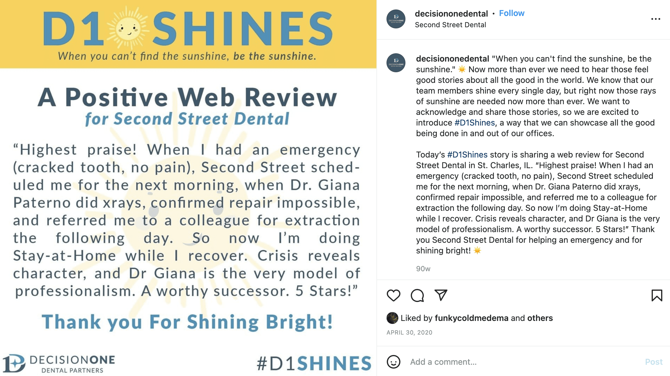 Here’s another example from DecisionOne Dental of how to creatively do social media marketing for healthcare. Note how the company uses social media to help shape public brand perception, whether it’s by spotlighting customers’ success stories or by communicating the company’s brand values.