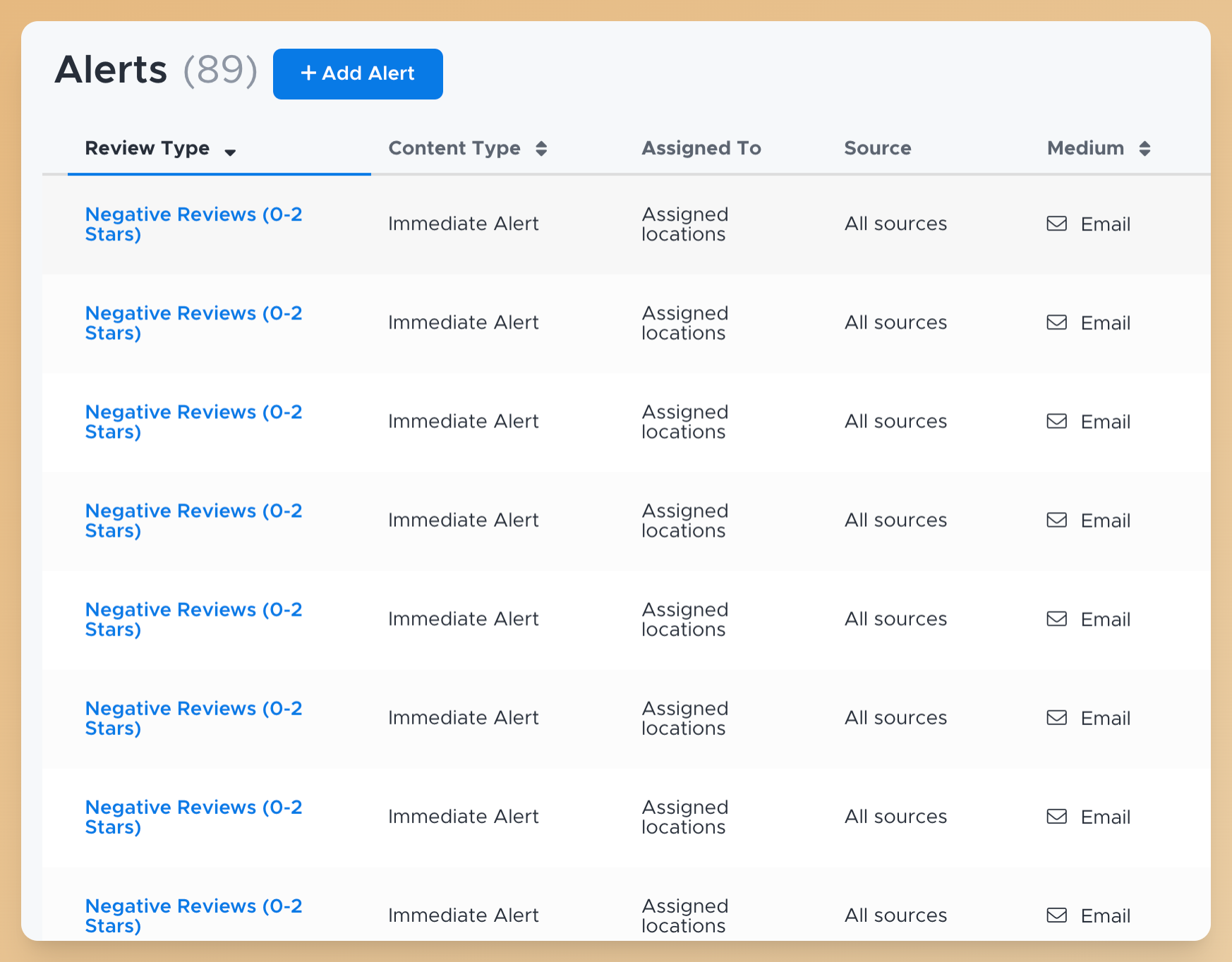 Review alerts are notifications sent to users on your team whenever customers provide feedback and leave online reviews. These notifications can be sent via email and SMS. Teams can customize review alerts based on review type/rating, review sources, assigned locations or location groups, and content type (immediate alerts, daily/weekly/monthly logs, daily/weekly/monthly summaries).
