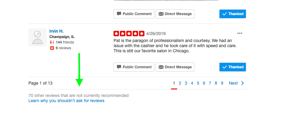 If a review is considered “not recommended” by Yelp’s recommendation software, it won’t be visible on your Yelp business page, which, by default, shows only the recommended reviews.