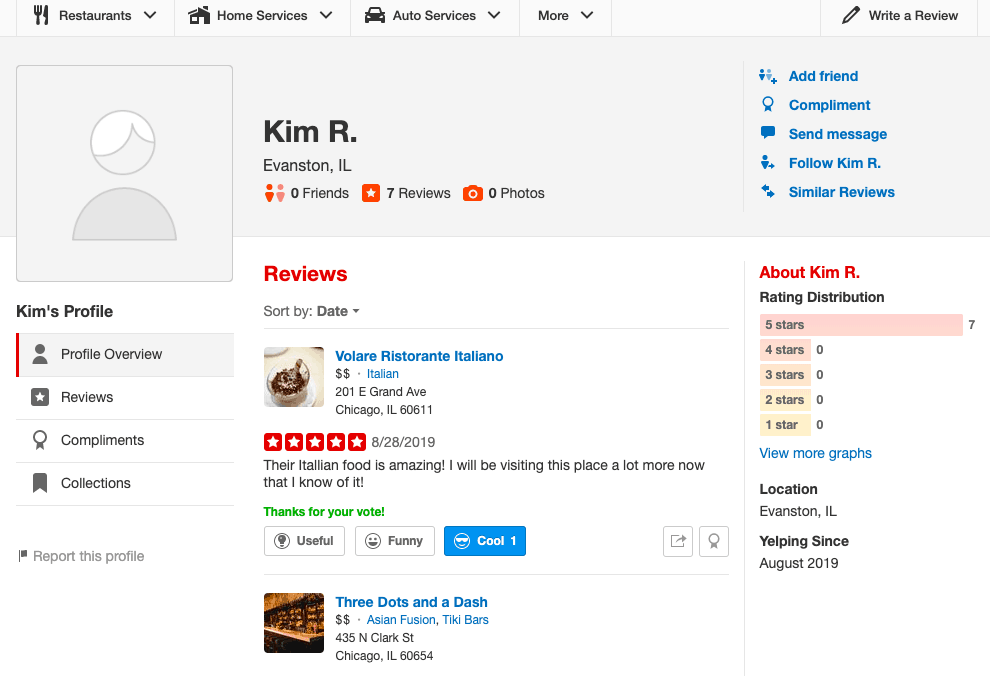 If you engage with your Yelp community and grow your relationships with customers, you’ll organically get reviews from people who are consistently active on Yelp, who have complete profiles that link to social accounts, who post negative and positive reviews, and who have friends in the Yelp community.