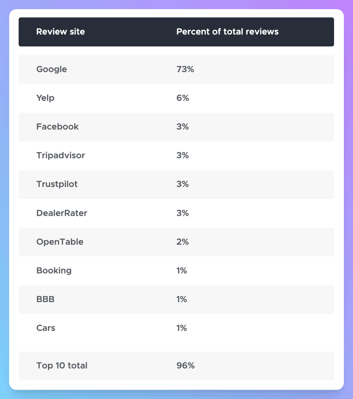 Google is also responsible for what is by far the largest distribution of online reviews across business review sites. According to a business directory list and analysis by ReviewTrackers, the top 4 sites are responsible for the distribution of 88% of all reviews, with Google (73%) leading the way, followed by Yelp (6%), Facebook (3%), and Tripadvisor (3%).