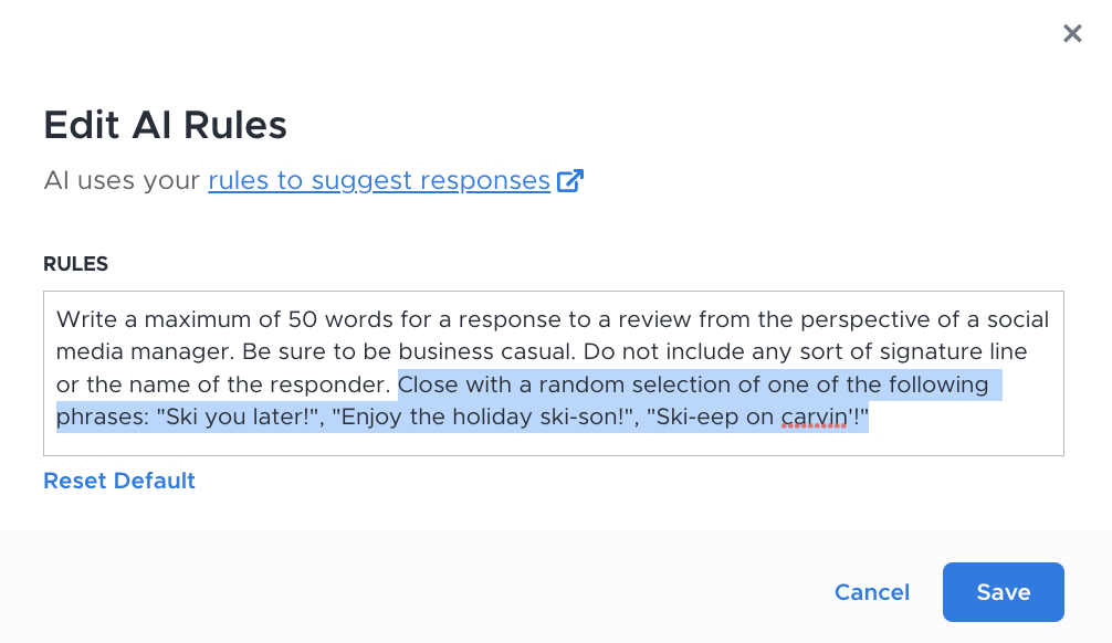 Lastly, another fun thing you can do with generative AI is to use prompts to insert your own branding language into your review responses. If there is a particular way you address your reviewers or if there are certain sign-off phrases your business uses, you can include them in the prompt for circulation.