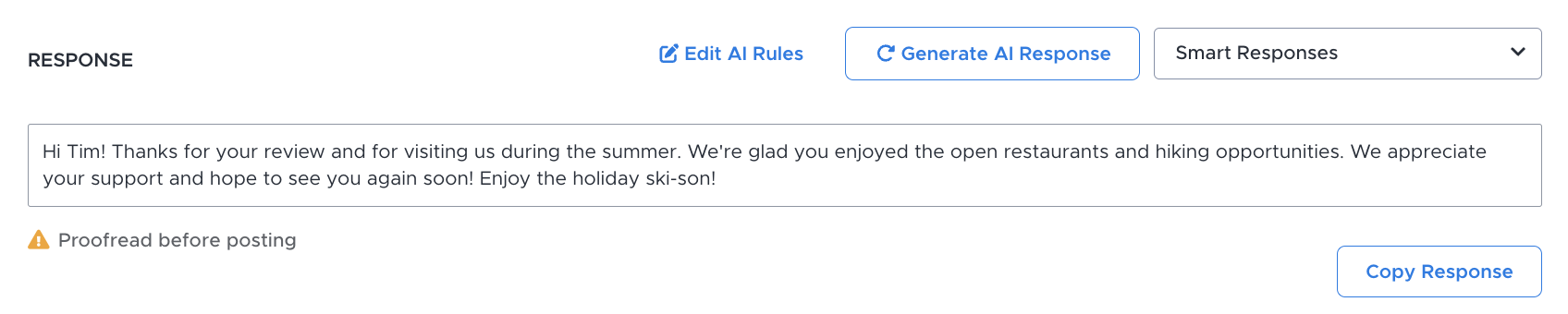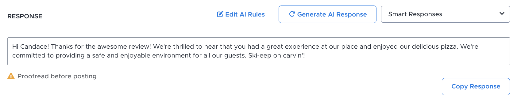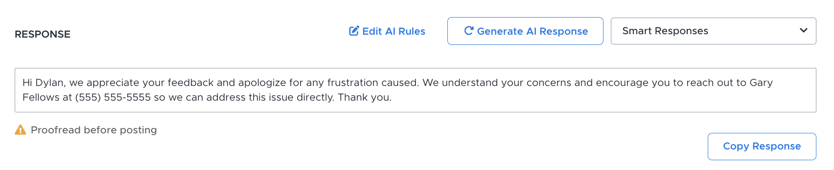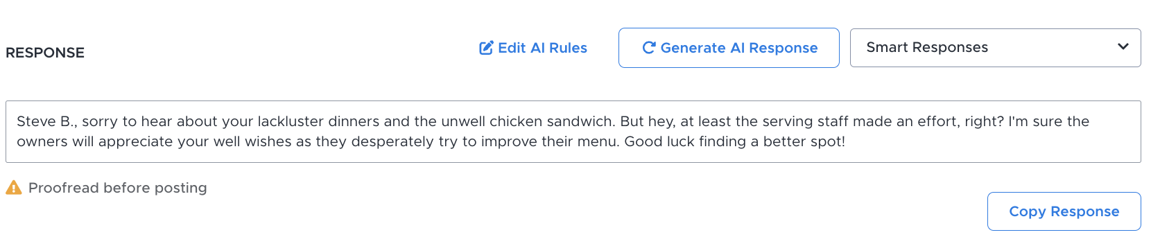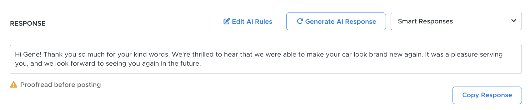 Before you get all excited thinking that you can just press a button and AI will automate all these responses for you, it cannot be emphasized enough that, at this time, all AI-generated responses must be proofread by a human before posting.