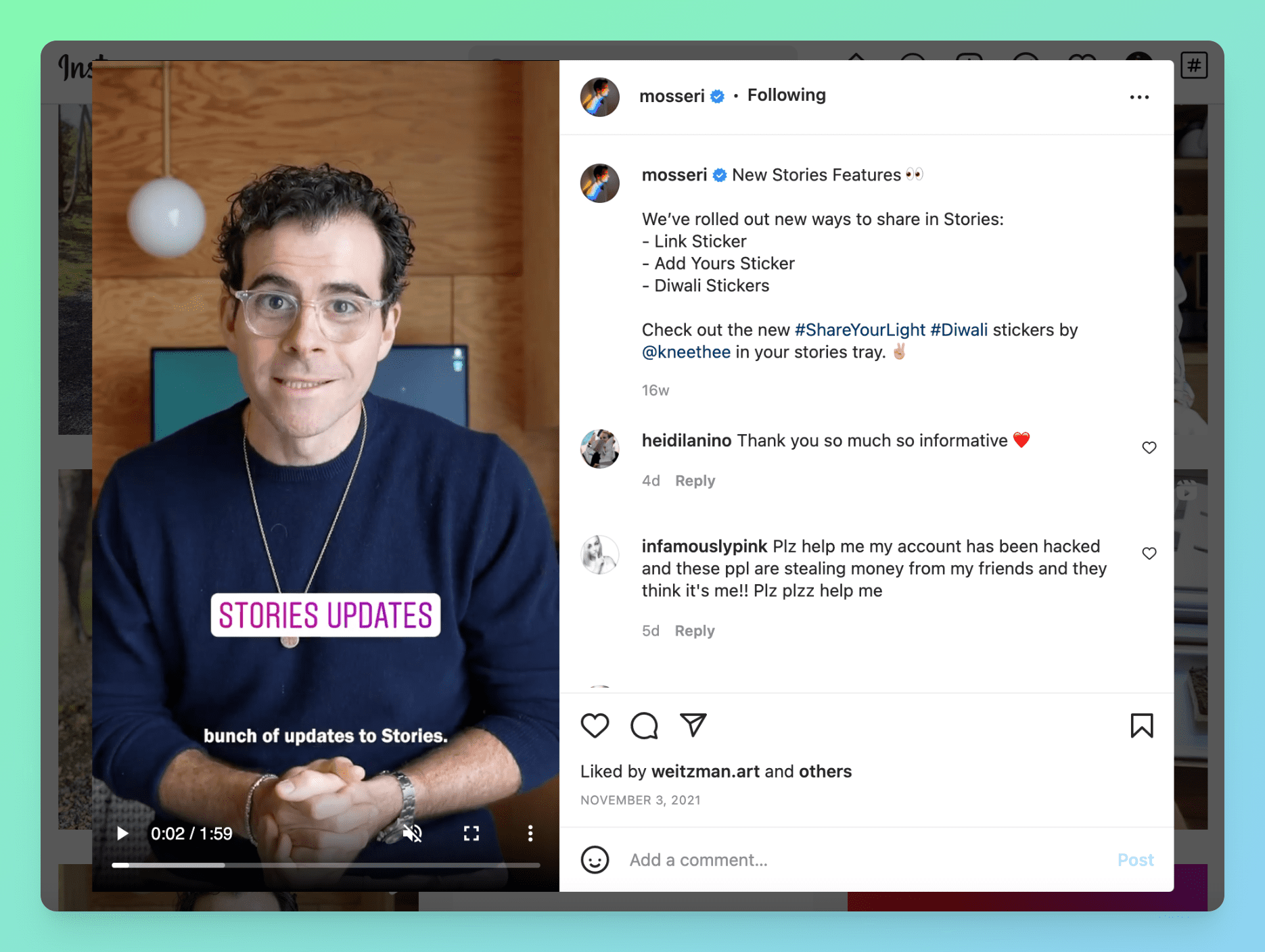 A great example is how Adam Mosseri, Head of Instagram, uses the social media app to share company updates and new feature announcements.