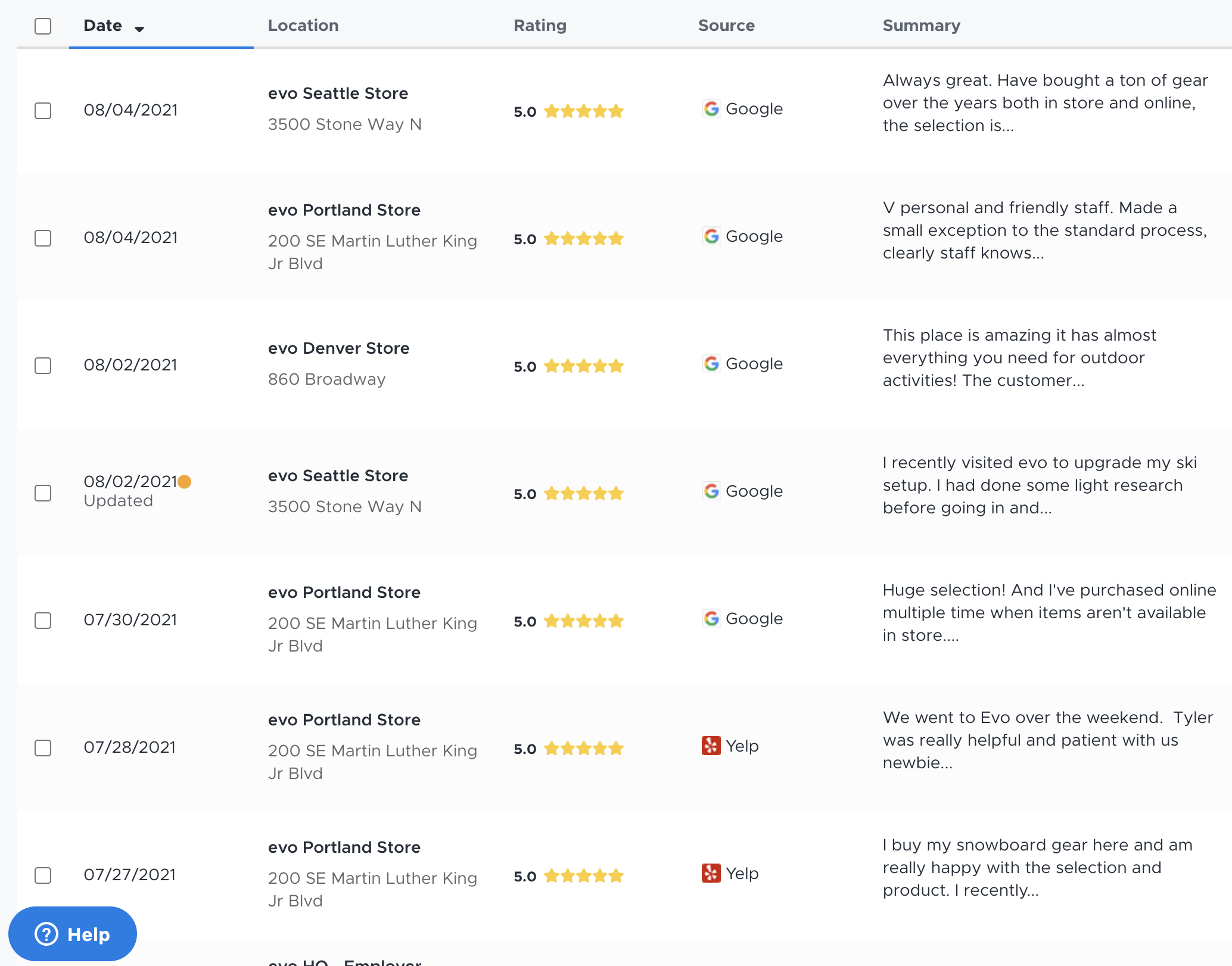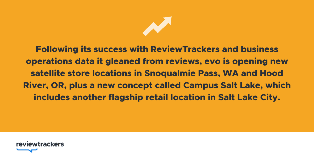 The entire evo organization understands and acts on this. Following its success with ReviewTrackers, evo is opening new satellite store locations in Snoqualmie Pass, WA and Hood River, OR, plus a new concept called Campus Salt Lake, which includes another flagship retail location in Salt Lake City.