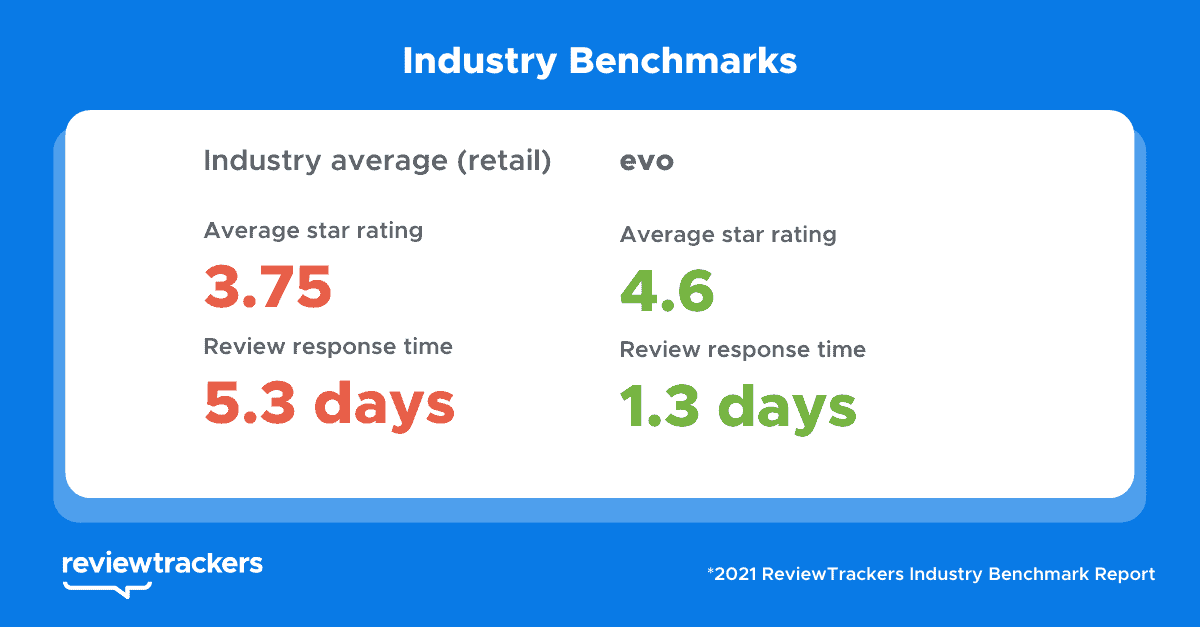 With ReviewTrackers, evo is performing well above industry standards. The average response time is more than 5 days for most retail brands. evo’s average is 1.33 days. In the last 6 months, the company has also improved its response time by 38%.