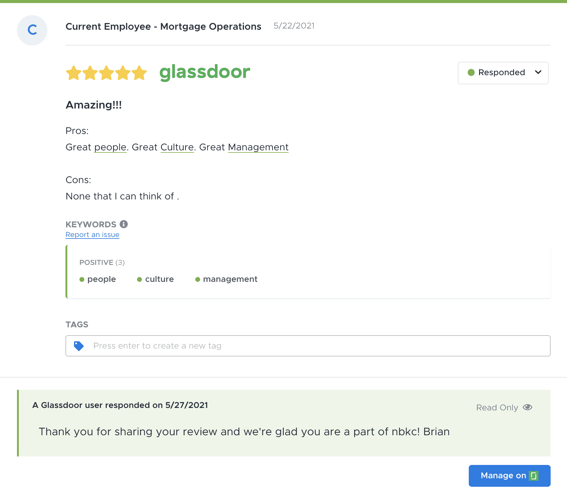 In this light, ReviewTrackers equips nbkc bank with tools to extend the scope of its online review management efforts beyond product and service reviews. The bank also has access to employee reviews data, powered by ReviewTrackers’ employer brand monitoring feature and sourced directly from nbkc bank’s Glassdoor and Indeed profiles.