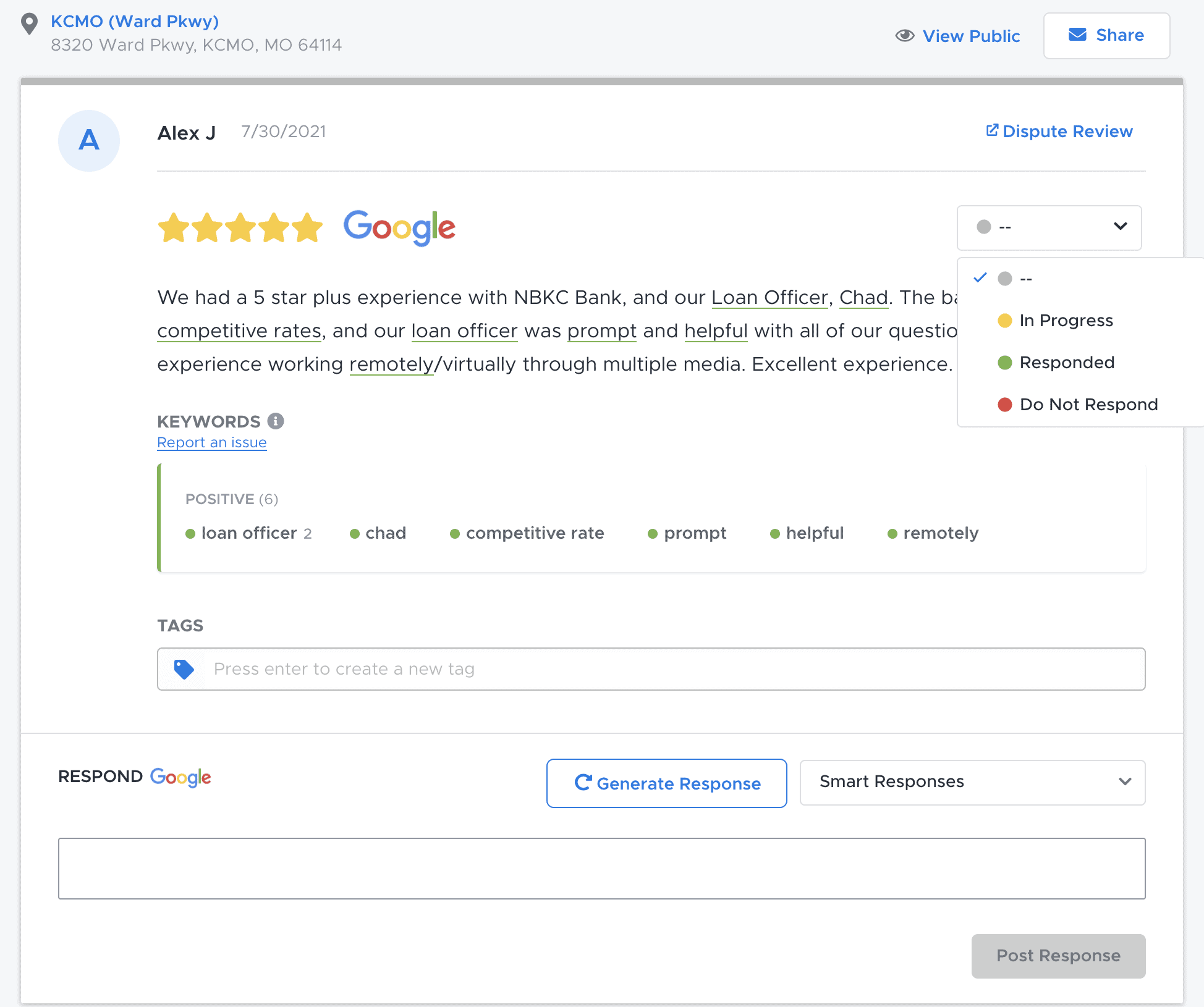 For nbkc bank, one of ReviewTrackers’ most widely used features is review tagging. This enables users to organize reviews and ratings according to their status: Responded, In Progress, or Do Not Respond. There’s also an option for adding custom tags on each individual review page.