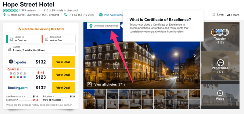 TripAdvisor’s Certificate of Excellence award is one of the most coveted badges of honor for businesses in the travel sector. It can help set your business apart from your competitors, improve your Tripadvisor ranking, and improve your brand visibility on the site.