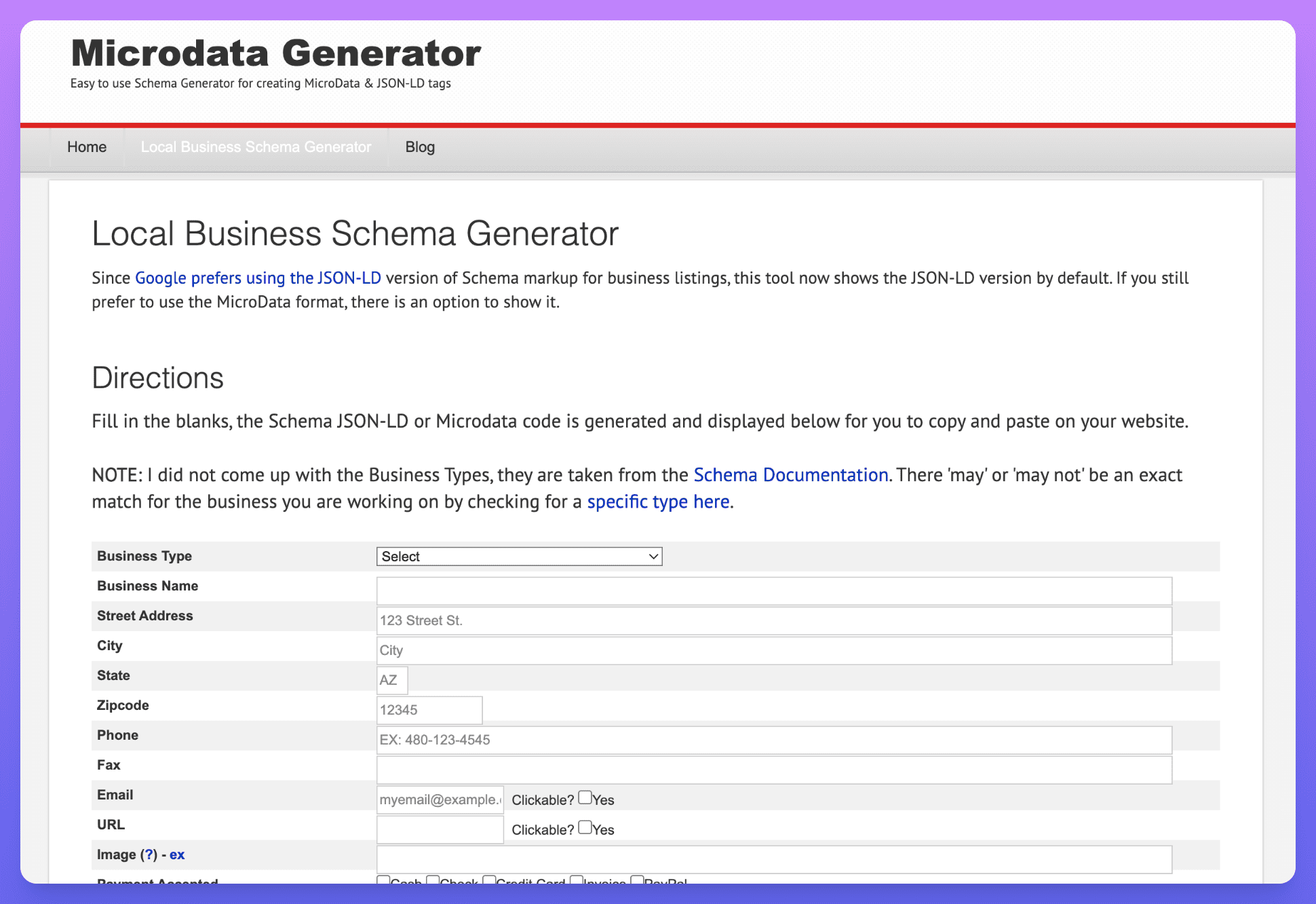 Simply fill out the form here and the Generator will use Google’s preferred Schema markup (JSON-LD) and build the code for you to copy and paste on your website. Don’t forget to check your work and test the output!