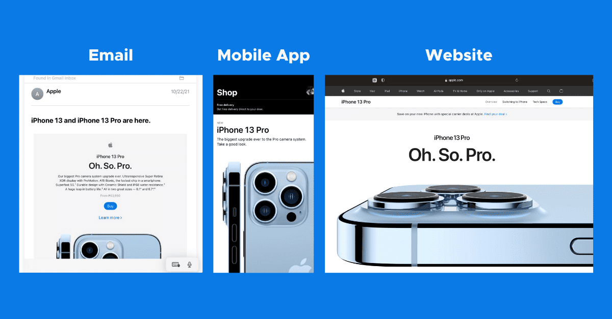 This is something that a company like Apple does very well. Check out this example of the way Apple marketed the launch of iPhone 13 Pro across email, its mobile retail app, and website.