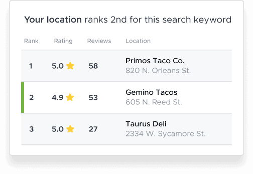 Compare where your brand ranks in local search results with the local competition and identify key areas to improve each location’s search rank results.