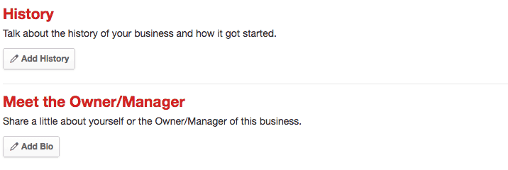 1. Edit the description in the “History” and “Meet the Owner/Manager” sections within the “Business Information” tab. You can click on the “Add” button in each section to create a new description. If you already have existing descriptions then you can click on the “Edit” link instead.