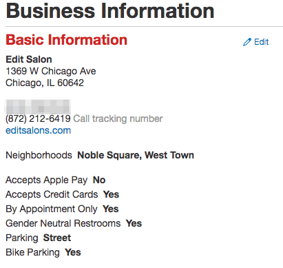 1. Click on the “Edit” link on a Yelp page’s general information card.