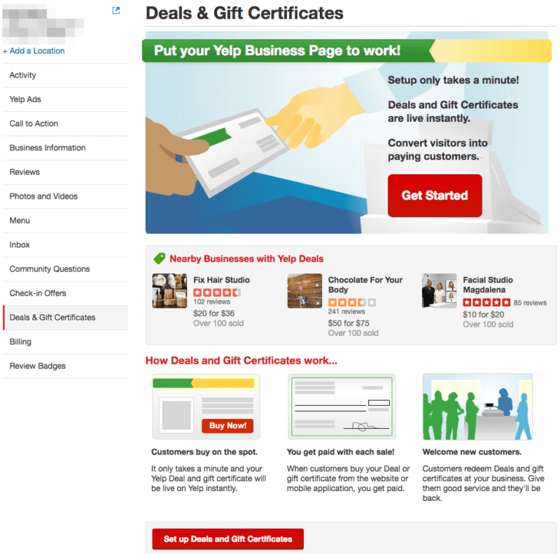 Yelp Ads includes multiple tools to help you create, monitor, and analyze the ads for your business page. Some of the features we previously mentioned – such as the Calls to Action buttons, Deals, and Gift Certificates – are all part of the Yelp Ads program.