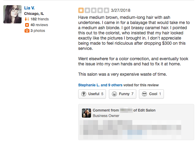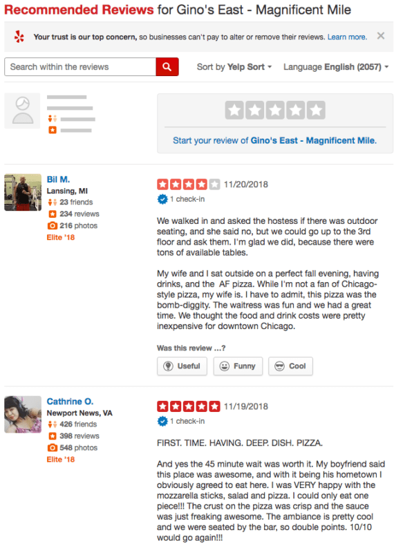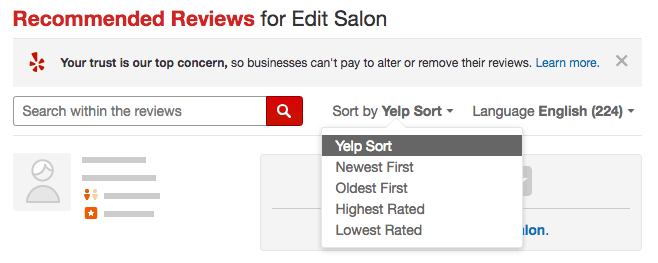 It’s unclear how Yelp sorts these reviews, but our observations seem to indicate that the internal algorithm utilizes multiple factors such as overall rating, if the review received votes, and when the review was posted. Being a Yelp Elite Squad member doesn’t seem to help in any way because the first page includes reviews from both regular and Elite users.