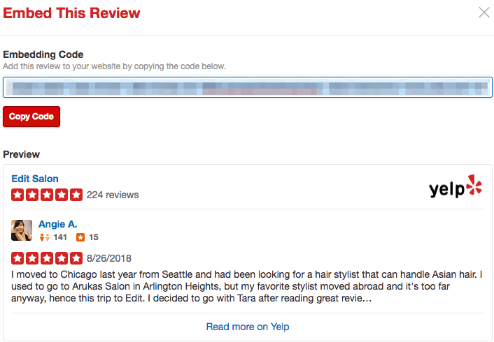 Keep in mind that the “Embed review” link is only available through the consumer-facing version of the Yelp page.