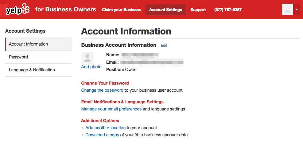 1. Go to the “Account Settings” tab at the top of the Yelp for Business Owners page and click on the “Account Information” section.