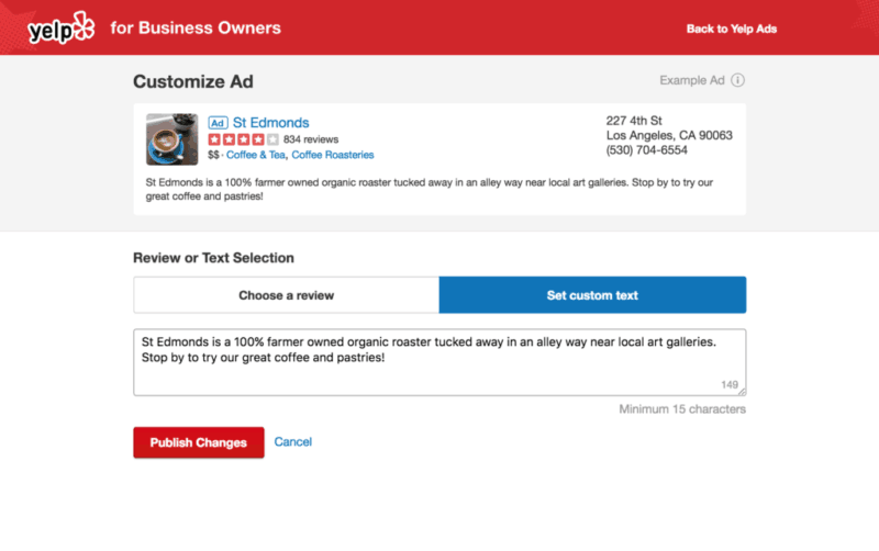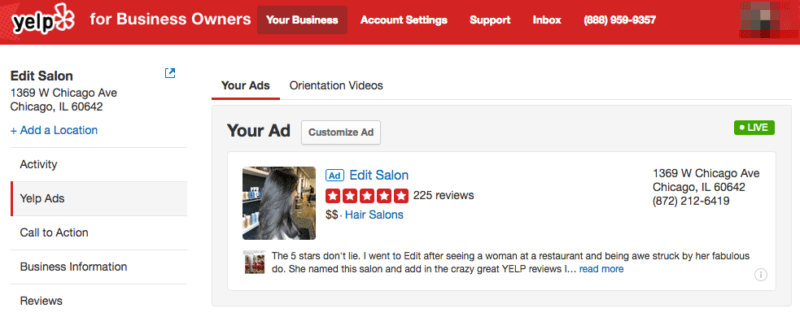 You can change these options by going to the “Yelp Ads” section and clicking on the “Customize Ad” button above your ad.