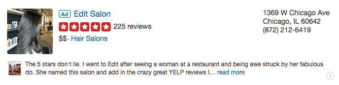 Targeted Ads: These are snippets of your business page that appear in search results, competitor pages, and the Yelp mobile website and app. It includes valuable information for the user including the business name, address, and phone number as well as its overall rating, a photo, and customer review.