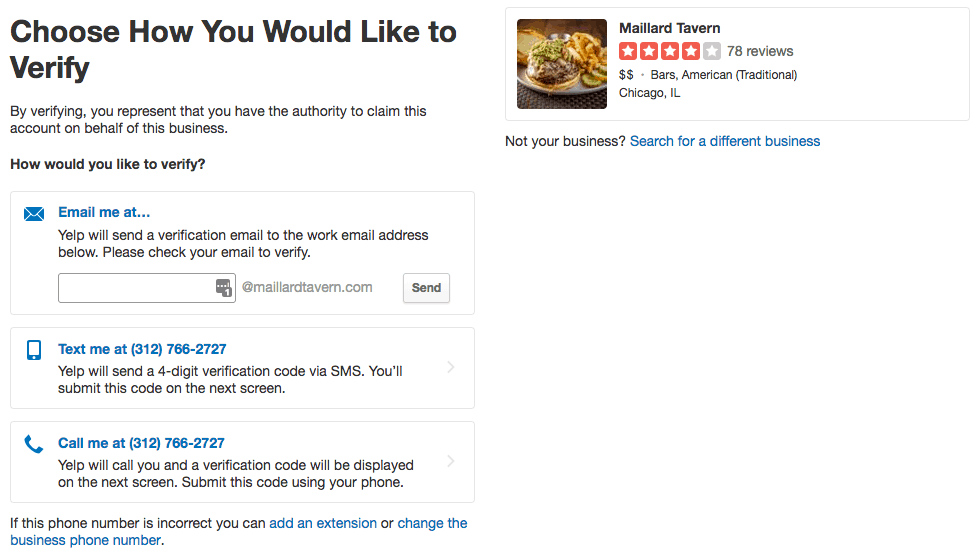 3. You’ll need to verify that you are authorized to claim the listing for the business. You can tell Yelp to send you a verification message at a work email address, send a four-digit verification code to the business phone number, or call that same number with the code.