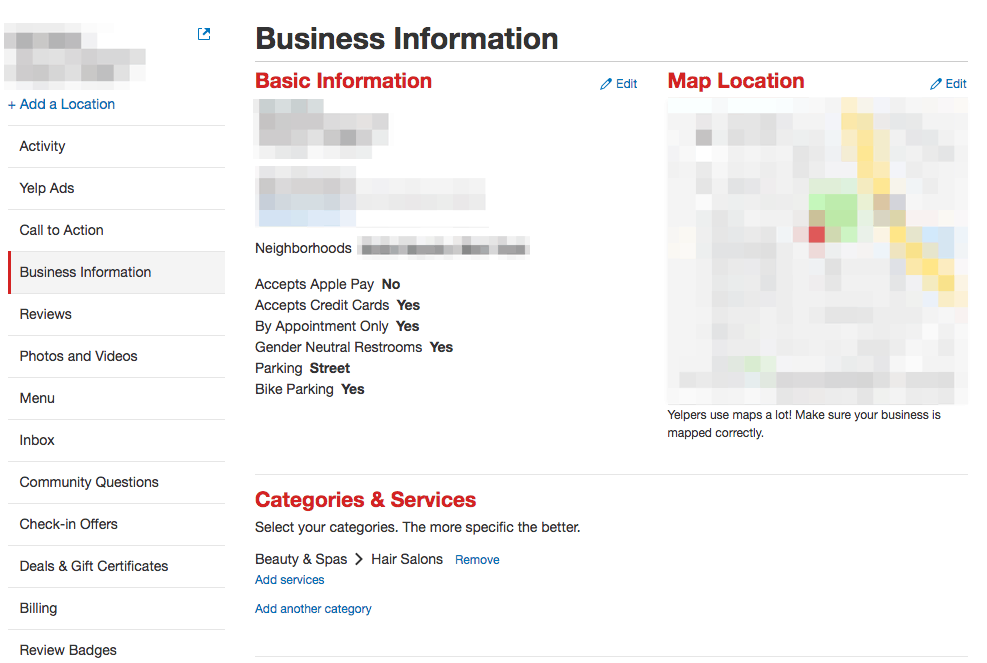 1. Go to the “Business Information” tab on the Yelp for Business Owners Page and find the “Categories and Services” section.