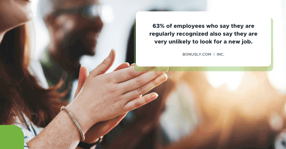 - According to a bonusly.com survey, 63% of employees who say they are regularly recognized also say they are very unlikely to look for a new job. (Inc)